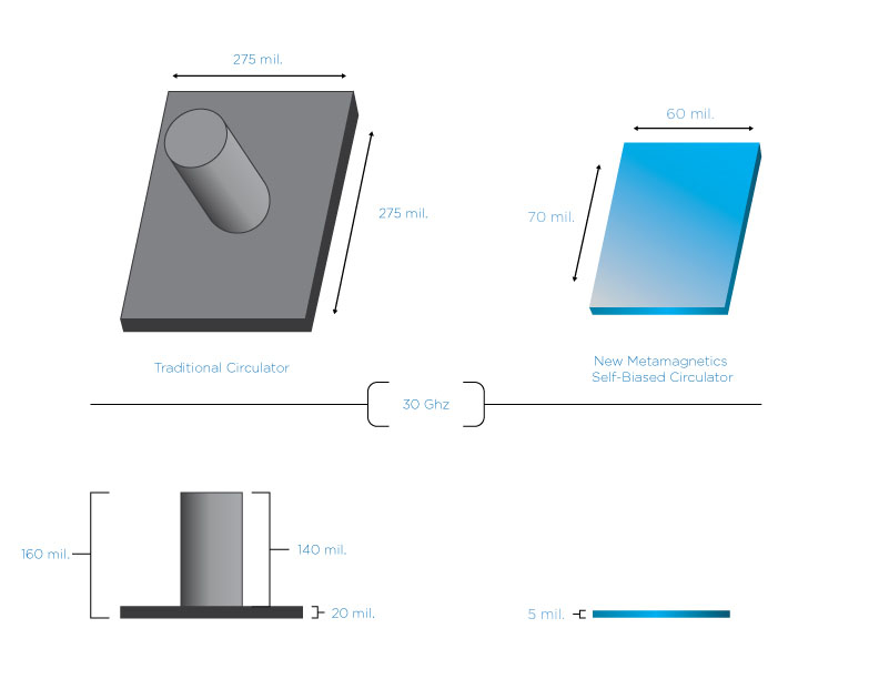 Side by side comparison of a traditional magnet-biased circulator (left) next to our self-biased planar monolithic circulator (right). Note that without a biasing magnet our circulator sits completely flat and is exceptionally smaller. A phased array radar system can have 5,000 to 10,000 of these components, making the Metamagnetics solution very attractive for achieving SWaP-C goals.